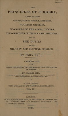 The principles of surgery, as they relate to wounds, ulcers, fistulæ, aneurisms, wounded arteries, fractures of the limbs, tumors, the operations of trepan and lithotomy. Also of the duties of the military and hospital surgeon / By John Bell.