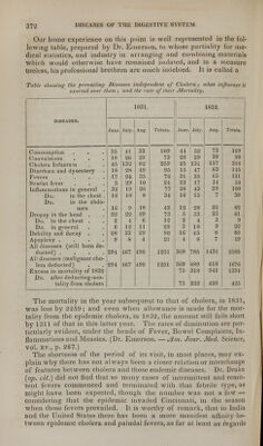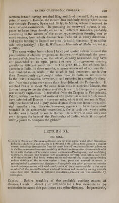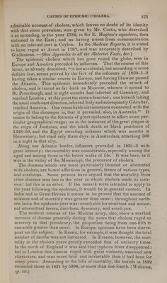 ![western branch having reached England [and Ireland], the extreme point of western Europe, the stream has suddenly retrograded to the east through France, Spain and Italy, to Malta, where it seemed to have become evanescent. In pursuing its westward course, it ap- pears to have been developed in two different manners, probably according to the nature of the country, sometimes forming one or more centres, from which disease has radiated in every direction ; and again running in lines of no great breadth, the country on either side being healthy. {Dr. R. Williams's Elements of Medicine, vol. ii., p. 000.) The same writer from whom I have just quoted relates some of the peculiarities of cholera progress, as follows: — Although the great streams of cholera have, on the whole, steadily advanced, they have not proceeded at an equal pace, the rate of progression varying greatly in different countries In the year 1817, the cholera had overrun in India, in three months, a space westward of not less than four hundred miles, while to the south it had penetrated no farther than Ganjam, only ejghty-eight miles from Calcutta, in six months. In the next six months, however, it had extended in a southerly direc- tion from that point over more than four-fifths of the Peninsular. It reached Pekin in about 'he same time that it attacked Muscat, the former being twice the distance of the latter. In Europe its progress was equally capricious. It travelled from the Caspian to Vologda and Pskou, within one hundred miles of the Baltic, at a rate which would have infected all Europe in three months, while it did not reach Riga, only one hundred and eighty miles distant from the latter town, until eight months after. Its rate, however, appears to have been most retarded in its retrograde movements, for it took six years after London was infected to reach Rome. In a word, it took only one year to span the base of the Peninsular of India, while it occupied twenty years to compass the globe. LECTURE XL. DR. BELL. Causks of Epidemic Cholera.—Connexion between cholera and other diseases— Influenza—Influenza and cholera in 1780 and 1781—Both have pursued a similar course, including divergencies from the main line—Prevalence of bowel affections in cholera seasons—Increased mortality at this time from other diseases—Scarlet fever with cholera.—The special cause unknown — Predisposing and modifying causes, in weather and season; low situations; poverty, destitution, and vice of the inhabitants ; had food ; watery fruits and vegetables ; intoxicating drinks ; sudden debility of the nervous system; fear; great and unusual exposure to atmospherical extremes and changes—Atmospheric and other phenomena anterior to and contemporaneous with cholera—Attacks of the disease mainly in the sum- mer-half of the year—Prevalent winds—Sickness and mortality among animals coincident with cholera in different countries—Cholera not transmissible by contagion. Causes. — Before speaking of the probable exciting causes of cholera, I wish to direct your attention for a few moments to the connection between this pestilence and other diseases. Its precursor,](https://iiif.wellcomecollection.org/image/b21156955_0379.jp2/full/800%2C/0/default.jpg)