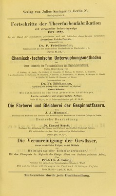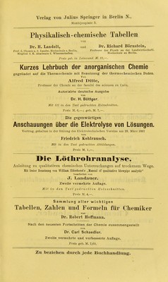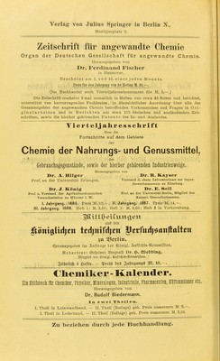 ![Monbijouplats! 3. Zeitschrift für angewandte Chemie Organ der Deutschen Gesellschaft für angewandte Chemie. Herausgegeben von Dr. Ferdinand Fiscliei* in llannovor. Erscheint am 1. und 15. eines jeden Monats. Preis für den Jahrgang von 24 Heften M. 20,—. (Im Buchhandel auch Vierteljahresabonnement für M. 5,—.) Die Zeitschrift erscheint 2 mal monatlich in Heften von etwa. 32 Seiten und berichtet, unterstützt von hervorragenden Fachleuten, in Ubersichtlicher Anordnung Uber alle das Gesammtgebiet der angevyaudten Chemie betreffenden Vorkommnisse und Fragen in Ori- ginalarbeiten und in Berichten aus etwa 170 deutschen und ausländischen Zeit- schriften, sowie die hierher gehörenden Patente des In- und Auslandes. Viert eljalir es Schrift über die Fortschritte auf dem Gebiete der Chemie der Nahrungs- und Genussmittel, A. . der V Gebrauchsgegenstände, sowie der hierher gehörenden Industriezweige. Herausgegeben von ]>r. A. Hilger »r. R. Kayser Prof. an der Universität Erlangen. Vorstand d. ehem. LaboratoriomB am bayer. Gewerbemuseum zu Ktimberg. I>r. J. KSnliT »r. E. Seil Prof. n. Vorstand der Agrikulturchemischen Prof. an der UniTersitSt Berlin, Mitglied dei VersuchBstation zu Münster i. W. Kaiserl. Gesundheitsamtes. I. Jahrgang. 1886. Preis M. 10,-. II. Jahrgang. 1887. Preis M. 14,—. III. Jahrgang. 1888. Heft 1: M. 2,60; Heft 2: M. 2,60; Heft 3 in Vorbereitung. aus ben jtt Sicrittt. ■fg^raaBgcgeben im S-uftrage icr -ßonigl. S,itfrid)t3--®onimtrri£m. SRebacteur: Oc^eimev SSergrat^ Dr. ip. SOBcbÖing» iUiitfltieb bei- Jlbnigl. SUufric^tä.^fommid'ion. Säörlidö 4 $cftc. - ^}JrciS bcS SaljrßuitBS 3)1.10,-. Chemiker - Kalender. Ein Mirsliiicli Iii ClBmilcer, Plysil^er, lineralosen, ininstrieue, Plaraacenten, Mttemnänner etc. Herausgegeben von Dr. Rudolf Biedermann. In zwei Tlieileii. I. Thell in Leinwandband. — U. Theil (Beilage) geh. Preis zusammen M. 3.-. I. Theil in Lederband. — II. Theil (Beilage) geh. Preis zusammen M. 3,50.](https://iiif.wellcomecollection.org/image/b21698521_0276.jp2/full/800%2C/0/default.jpg)