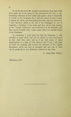 Catalogue of the charters, deeds and manuscripts in the Public Reference Library at Sheffield / prepared by T. Walter Hall.
