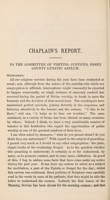 Report of the Committee of Visitors, the Medical Superintendent, and other papers relating to the asylum : printed by order of the Court of the January Quarter Session, 1869 / Essex Lunatic Asylum.