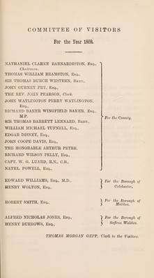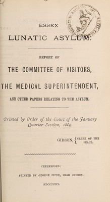 Report of the Committee of Visitors, the Medical Superintendent, and other papers relating to the asylum : printed by order of the Court of the January Quarter Session, 1869 / Essex Lunatic Asylum.