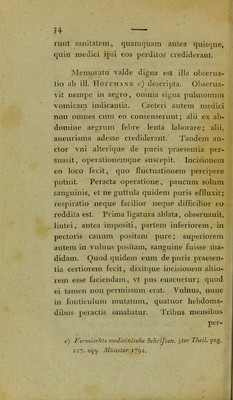 ![enim, musculis et pleura vix perscissis, magnani puris copiam iam effluxisse; nullam autem pleurae cum pu]monii)us coalitionis fecit men- tionem; niliil porro dixit de incisione pulmo- nis, an abscessus altior in pulmonis substan- tia versatus sit, ncc ne; paucis, rerum, in ab- scessu pulmonum aperiendo memoratu digna- rum, nullam fecit mentionem, atque ex lioc intelligenclum esse puto, vel abscessum mi- nime in pulmonibus fuisse, vel cbirurgum operationis descriptionem baud accurate con- scripsisse. Nunc mibi liceat, quaedam de cura, post operationem addere. Accidere potest, vt, facta incisione, a^uI- nereque ampliato, cannula intrusa, nil tamen purulentae materiae effluat. Tunc quidem adeo crassa est, vt per cannulam .effluere non possit. Quod si ita', materia diluenda et adtenuanda est; quem in finem, iniiciantur per cannulam, ope sipbonis, aquea, dikientia, adtenuantia et emollientia; decoctum Hordei, Maluae, nuUa autem irritantia, quibus dulcia, vt melRosarum, addenda sunt. Tunc caute fiat iniectio; dein , lenis conquassatio, et ad expellendam niateriam aeger paulo fortius in- spiret. Haec iniectio repetatur, donec in- iectuni](https://iiif.wellcomecollection.org/image/b22302414_0038.jp2/full/800%2C/0/default.jpg)