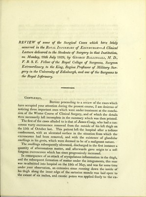 A clinical lecture delivered to the students of surgery in the Royal Infirmary of Edinburgh, at the conclusion of the summer course for 1828. Edinburgh, July 1828 / [George Ballingall].
