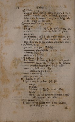 Credit: Conspectus formularum medicarum : exhibens tabulis XVI tam methodum rationalem, quam remediorum specimina, ex praxi Stahliana potissimum desumta / [Johann Juncker]. Source: Wellcome Collection.