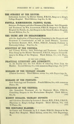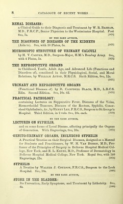 ![RENAL DISEASES: a Clinical Guide to their Diagnosis and Treatment by W. R. Basham, M.D., F.R.C.P., Senior Physician to the Westminster Hospital. Post 8vo, 7s. 0870] BY TXIE SAME AUTHOR, THE DIAGNOSIS OE DISEASES OF THE KIDNEYS (Aids to). 8vo, with 10 Plates, 5s. [1872] MICROSCOPIC STRUCTURE OE URINARY CALCULI by H. Y. Carter, M.D., Sui-geon-Maior, H.M.’s Bombay Army. 8vo, with 4 Plates, 5s. [1873] THE REPRODUCTIVE ORGANS in Childhood, Youth, Adult Age, and Advanced Life (Functions and Disorders of), considered in their Physiological, Social, and Moral Relations, by William Actoh, M.R.C.S. Sixth Edition, 8vo, 12s. [1875] URINARY AND REPRODUCTIVE ORGANS (Functional Diseases of) by D. Campbell Black, M.D., L.R.C.S. Edin. Second Edition. 8vo, 10s. 6d. [1875] PRACTICAL PATHOLOGY: containing Lectures on Suppurative Fever, Diseases of the Veins, Hsemorrhoidal Tumours, Diseases of the Rectum, Syphilis, Gonor- rheal Ophthalmia, &c., by Henry Lee, F.R.C.S., Surgeon to St.George’s Hospital. Third Edition, in 2 vols. Svo, 10s. each. [1870] BY THE SAME AUTHOR, LECTURES ON SYPHILIS, and on some forms of Local Disease, affecting principally the Organs of Generation. With Engravings, Svo, 10s. [1875] BENITO-URINARY ORGANS, INCLUDING SYPHILIS A Practical Treatise on their Surgical Diseases, designed as a Manual for Students and Practitioners, by W. H. Van Buren, M.D., Pro- fessor of the Principles of Surgery in Bellevue Hospital Medical Col- lege, New York, and E. L. Keyes, M.D., Professor of Dermatology in Bellevue Hospital Medical College, New York. Royal 8vo, with 140 Engravings, 21s. [1874] SYPHILIS A Treatise by Walter J. Coulson, F.R.C.S., Surgeon to the Lock Hospital. Svo, 10s. [1869] BY THE SAME AUTHOR, STONE IN THE BLADDER: Its Prevention, Early Symptoms, and Treatment by Lithotrity. 8vo, 6s. [1868J](https://iiif.wellcomecollection.org/image/b21965237_1218.jp2/full/800%2C/0/default.jpg)