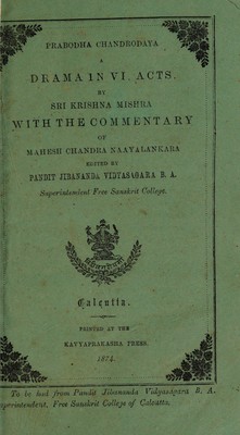 Prabodhacandrodayanāṭakam / Śrīkr̥ṣṇamiśraviracitam, Śrīmaheśacandranyāyalaṅkāra[sic]-kr̥ta-ṭīkāsahitam, Śrījīvānanda-vidyāsāgara-Bhaṭṭācāryyeṇa saṃskr̥tam.