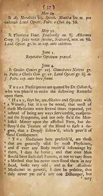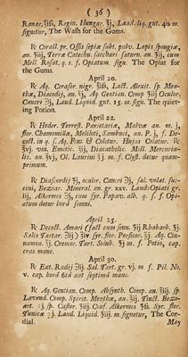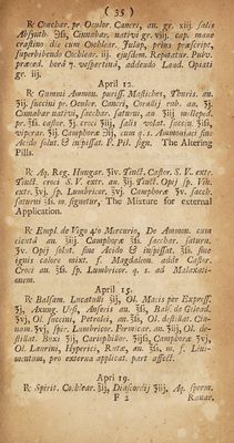 ![( 3Jj) R Gonchar, pr. Oculor. Cancri, an. gr. xiij. falls Abfynth* 9ls3 Cmnabar. nativi gr. viij. cap. mane craftino die cum Cochlear. Julap, prlus prreficript, fuperhibendo Cochlear. iij. ejufidem. Repet at ur. Pulv. priced, hora q. vefipertind3 addendo Laud. Opiatl gr. iij. April 12. R Gummi Ammon, pur iff. Maftiches, fhurls. an. ?ij. fuccinl pr. Oculor. Cancri, Cor aliij rub. an. fi\. Cinnabar nativi, fiac char. fatumi, an. milleped. pr. §fs. cafior. fy croci yn], fulls volat. fiuccin. fiPs, viper ar. fij. Camphor re 9ij, cum q.s. Ammo ni act fine Ac:do folut. inf ifiat. F. Pil. fign. The Altering Pills. R: Aq. Reg. Hangar. fiiv. fin A. Cafior, S. V. extr. fin A. croci S. V. extr. an. ?ij. fin A. Opij fp. Vih. extr. Jvj. fp. Lumbricor. 5vj, Camphors ?v. facch. fatumi fis. m.fignetur, The Mixture for external Application. R Empl. de Vigo 4to Mercurio. Be Ammon, cum cicuta an. $iij. Camphor re fls. facch ar. fiatum. ^v. Opij folut. fine Acido id infpiffat. ffs. fine ignis calore mixt. f Magdaleon. adds Cafior. Croci an. fip. Lumbricor. q. s. ad Malaxati-■ onetn. . •' April 15. R Balfam. Lucatulli $ij? 01. Macis per Expreffi % Axung. Ur fit, Anfieris an. 7fis, Ralfi de Gilead. 5vj3 01. fiuccini, Petrolei, anfifs, 01. defhUdt. du¬ nam. ivj> fp ir. Lumbricor. Formicar. an. f\\], 01. de- ftillat. Buxi f\), Cariophillor. ?ijfs5 Camphorre 5vj, O/. Laurini, Hyperici, Rutre, §is-, mentum 3 pro externa applicat. part a fie A. Apri 19. R Spirit. Cochlear. |ij, Diafcordij ?iij* Aq. fipcrm. F 2 Ranar»](https://iiif.wellcomecollection.org/image/b30546461_0043.jp2/full/800%2C/0/default.jpg)