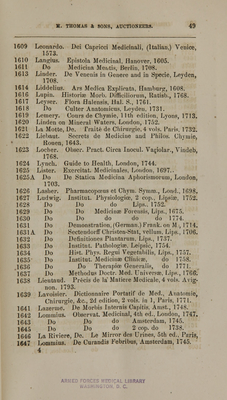 Credit: Catalogue of the extensive and valuable medical, theological, and miscellaneous library of the late John Redman Coxe, M.D : which includes many very rare, valuable, and interesting works in various languages : to be sold by order of executors on Tuesday, November 1st, 1864 and following days until finished, commencing each day at 10 o'clock a.m. at the auction rooms of the subscribers, M. Thomas & Sons, auctioneers. Source: Wellcome Collection.