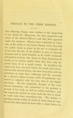 On the preservation of health, or, Essays explanatory of the principles to be adopted by those who desire to avoid disease / by Thomas Inman.