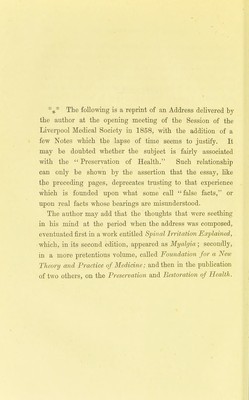 On the preservation of health, or, Essays explanatory of the principles to be adopted by those who desire to avoid disease / by Thomas Inman.