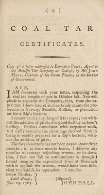 Credit: Account of the qualities and uses of coal tar and coal varnish. With certificates from shipmasters and others / [Anon]. Source: Wellcome Collection.