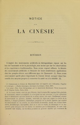 Notice sur la cinésie, ou, L'art du mouvement curatif dans ses rapports avec les mouvements naturels de l'organisme humain / par M.N. Dally.