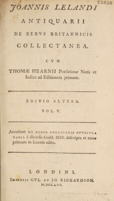 Credit: De rebus Britannicis collectanea / Cum Thomae Hearnii praefatione notis et indice ad editionem primam. Source: Wellcome Collection.