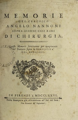 Memorie ... sopra alcuni casi rari di chirurgia. Queste memorie serviranno per compimento del Trattato sopra la semplicità del medicare / [Angelo Nannoni].