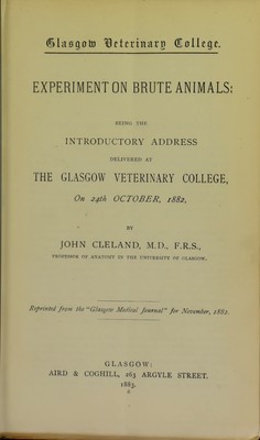 Experiment on brute animals : being the introductory address delivered at the Glasgow Veterinary College, on 24th October, 1882 / by John Cleland.