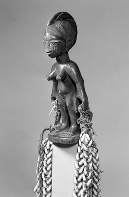 Credit: M0019380EB: One of a pair of Ibeji: female figure with long strings of cowrie shells, Nigeria: side view. Source: Wellcome Collection.
