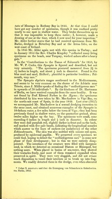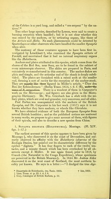 ![■ JrnACiL* <C [From the Proceedings of the Zoological Si July 13, 1858.] On the Genus Synapta. By S. P. Woodward and Lucas Barrett. (Communicated by J. S. Gaskoin, Esq.) (Radiata, PI. XIV.) The marine animals allied to the Sea Cucumbers, forming the genus Synapta, possess a peculiar interest for that large class of persons who study Natural History with the microscope, because they alford the miniature Anchors, of which a hundred may be shown in the field of the “inch object-glass,” and thousands some- times exist in the space of a square inch—each elegant in form and perfectly finished, and articulated to an anchor-plate whose pattern (as well as that of the anchor itself) is characteristic of the species to which it belongs. Curiously enough, these anchors were unknown to all the earlier writers, and most of the moderns. Forskal, who had the merit of describing two species of Synapta so long ago as 1775, remarked that they “ adhered to the finger by glutinous papillae invisible to the eye.” O. F. Muller called the Northern species Holothuria in- hcerens for the same reason. And Eschscholtz, who met with several species at Tahiti and on the coast of Russian America, concluded that they ought “ to form a class apart, not having tubular feet, but adhering, by means of their sharp skin, to extraneous objects, on which account they might be called Synapta Only five years ago (in 1853) Mr. Cocks of Falmouth described two British species, and gave a magnified figure of the skin without seeing the anchors. And still more recently Mr. Gosse was unable to find them, even with the aid of a microscope +• However, they are present in all the examples that have come under our notice, and they can always be seen with a common pocket lens. Indeed the larger anchors of Synapta digitata are nearly half a line in length, and visible to the unassisted eye. Jseger says that all the anchors of his Synapta Beselii are |rd of a line in length, and can be seen without a glass. This great Synapta * Appendix to Kotzebue’s Second Voyage, 8vo, Lond. 1830, p. 338. Van der Hoeven makes Eschscholtz say the Synapta adheres “ by means of small hook- lets ; ” but this expression (der sie uberall wie Kletten anhangen) is employed in the introductory paragraph. In the special description of Synapta he only speaks of “ small roughnesses (Rauhigkeiten) invisible to the naked eye.” And he de- scribes Chiridota verrucosa as, “ corpore undique verrucis rubris adhaerentibus obsito.”—Zool. Atlas, fol. Berlin, 1829. t Aquarium, p. 243. iety of London, I V](https://iiif.wellcomecollection.org/image/b22453258_0003.jp2/full/800%2C/0/default.jpg)