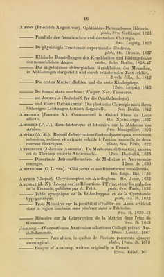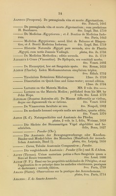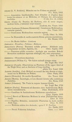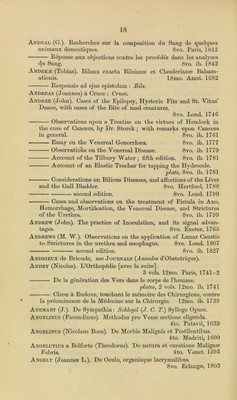 ![Alix (Matliseus F.). Observata Chirurgica. 4 vols. 12mo. Altenburgi, et Francof. ad Moen. 1774-8 Allan (Robert). Treatise on the operation of Lithotomy, the danger of the gorget, and superiority of the knife and staff. plates, folio, Edinb. 1808 System of pathological and operative Surgery, founded on Anatomy. plates, 3 vols. 8vo. ib. 1819-27 Allanby (Joseph S.). *De Hydrope Pectoris. 8vo. Edinb. 1821 Allaxinus (Jacobus). Medicie disceptationes. 12mo. Paris, 1535 Allegri (Girolamo). Espositione sopra la Polvere dell’Algarotto. 18mo. Brescia, 16G6 Allen (Jacobus). “Be Cynanche Tonsillari. 8vo. Edinb. 1820 Allen (Joannes). Synopsis universe Medicinse practicse sive doctis- simorum virorum de Morbis judicia; editio tertia. 2 vols. in 1, 8vo. Lond. 1729 editio nova Yeneta. 3 vols. 8vo. Yenet. 1762 Abrege de toute la Medecine pratique. 3 vols. 12mo. Paris, 1728 Allen (John) : Cuvier s Animal Economy. Allen (M.). Observations on the “Act for the better management of Blouses for the Insane.” folio, Lond. 1831 Essay on the Classification of the Insane [with the affidavits in the trial “Allen versus Dutton,” and history of Mrs. Dutton’s case]. 8vo. ib. 1838 Allesley (Sir T.), Murder of: Donellan. Alley (George). Essay on a peculiar Eruptive Disease, from the exhi- bition of Mercury. 8vo. Dublin, 1804 Observations on the Hydrargyria, or Yesicular Disease from the exhibition of Mercury. plates, 4to. Lond. 1810 Allionius (Carolus). Tractatio de Miliarium origine et curatione. 8vo. Augustie Taurin. 1758 Conspectus prsesentaneie Morborum conditionis. 8vo. ib. 1793 Allison (Edward D.). Observations on instituting a friendly Asso- ciation of the Medical Profession in Scotland. 8vo. Edinb. 1826 Allyatt (R. H.). Tic Douloureux, or neuralgia facialis, and other nervous affections; second edition. 12mo. Lond. 1843 Almanacks, see Journals. Almansor: Articella; Gatinaria; Solo. Almas (Paulus Balogh de F.). *De evolutione et vita Encephali. 8vo. Pestini, 1823 Almeida (Tlieodorus de). Physicse Institutiones. plates, 3 vols. 12mo. Olisipone, 1785-93 Almenar (John): Luisini Aphrod. ■ On the French Pocks: Clowes. Aloy (Franciscus). *De Ileo. 4to. Monspelii, 1774](https://iiif.wellcomecollection.org/image/b21920722_0025.jp2/full/800%2C/0/default.jpg)