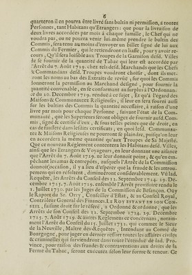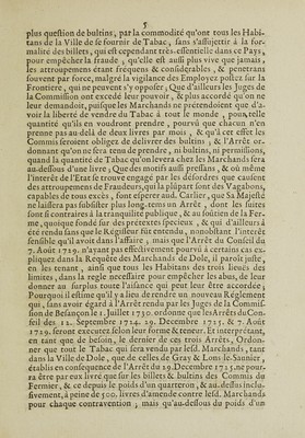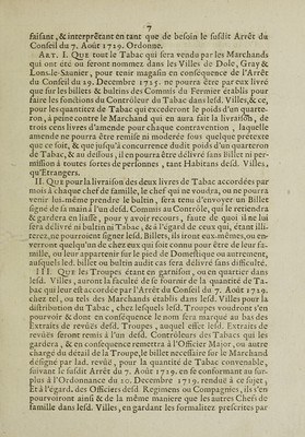 Arrest ... concernant la vente et distribution du tabac dans les villes de Dole, Gray et Lons-le-Saunier: et reglement pour empêcher la fraude dans la province de Franche-Comté. Du 14 octobre 1732.