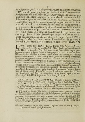 Credit: Arrest ... concernant la vente et distribution du tabac dans les villes de Dole, Gray et Lons-le-Saunier: et reglement pour empêcher la fraude dans la province de Franche-Comté. Du 14 octobre 1732. Source: Wellcome Collection.