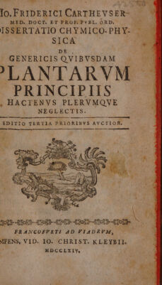 Io. Friderici Carthevser ... Dissertatio chymico physica de genericis qvibvsdam plantarvm principiis hactenvs plervmqve neglectis / [Johann Friedrich Cartheuser].