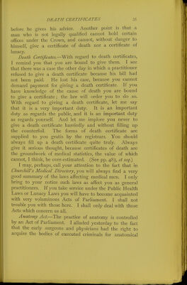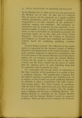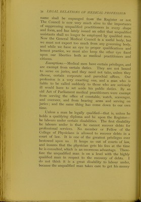 ![the Apothecaries' Company is an offshoot of the Grocers' Company. The grocers were people largely concerned in importing what we should call colonial goods. With these they imported a good many things which were used in medicine as well as in cookery, and it is not surprising that as medicine advanced, the number of drugs multiplied prodigiously, and that a separate company was organised for their supply. The apothecaries were established in the early days of James I., in the hall close to Blackfriars Bridge, which no doubt many of you know. In its early days the College of Physicians exercised very great powers. They had absolute control over the practice of medicine in London and a certain radius round it, and they often put irregular practitioners in the lock-up. The surgeons might not administer drugs, and there is a case on record of the President of the College of Physicians putting a surgeon in prison for administer- ing a purgative. Those early physicians undertook a great many prosecutions of quacks, and it is interesting to note that these prosecutions often came to nought, because then, as now, the quacks had influential friends among the governing classes. The early physicians set their faces also against unpro- fessional conduct, and if a man's conduct and morals were not what they ought to be, they drummed him out of their society, and held him up to public obloquy. Next we find apothecaries, who were originally druggists pure and simple, prescribing. For a long time a battle raged between the physicians and the apothe- caries, but ultimately the apothecary became a practitioner who supplied medicine, and a very useful person he was and is. Modern Legislation.~T]\& profession remained in a rather chaotic condition until the middle of the present century. It was in 1858 that the first Medical Act was passed. That Medical Act was amended or supplanted](https://iiif.wellcomecollection.org/image/b22652073_0061.jp2/full/800%2C/0/default.jpg)