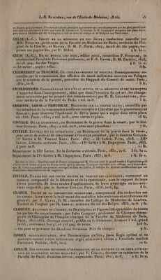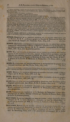 ![æ PA 0 EE NN SEE TNT ee ne ee PU ART 5° Action immédiate et médiration chez l'homme et les animaux , dans l'état sain et dans l’état morbide; ef- fets thérapeutiques: doses; formes; mode d'administration , adjuvans et correctifs ; indications et contre-indica- tour; IDCONVEUIENS. ! ) À 6% Opinions diversés des auteurs; classification. * 7° Combinaisons ; mélanges ; composés pharmaceutiques. 8 Bibliographie , article important qui manque daus les ouyrages analogues, Cet ourrage immenre contient nen-seulement l'histoire complète de tous les médicamens des trois règnes, sans ovblier, les ‘gens, de la physique.,tels.que l'air; le calorique , l'électricité, elc!, lés produits chimiques, les eaux minérales st artificielles, décrites au nombre de 1800 { c'est à-dire le double au moins de ce qu'en contien- nent les Traités spéciaux, ; mais il renferme de plus l'Histoire des poisons , des miasmes , des virus , des veuins ë considérés partisulièremeut sous le porn] de vue du traitement spécifique des accidens qu'ils déterminent: enèn (celle 1des'glimens envisagés sous le rapport de la diète et du régime dans les maladies. Des artieles généraux, relatifs aux classes des médieamens et des produits pharmaceutiques ; aux familles naturelles et aux genres jani- maux et végétaux. Enfin certaines pratiques ou operations chiruigicales, applicables âux traitemens des :ma- Jadies internes, complètent l'ensemble des objets qui sont du domaine de la wiatière médicale et de la thérapeu- tique. Une vaste synonyinie embrasse tous les noms scientifiques, officinaux, vulgaires, français et étrangers, ctllesmême de poys., c’est-à-dire les noms médicamenteux particulièrement propres à telle où telle contrée, plus barbares, Fôus ces avantages réunis font de ce Dictionnaire polyglotte, un ouvrage pratique à l'usage de toutes les nations, le seul jusqu'ici dont soit enrichie la littérature médicale. DUBLED..Exr0SiTION DE LA NOUVELLE DOCTRINE SUR LA MALADIE VÉNÉRIENNE; Par “À. Durzer, D. M. P., professeur agrégé à la Faculté de Médecine de Paris ,; an- cien interne de l’hospice des Vénériens. Paris, 1829, in-8. 2 fr. 50€. DUFOUR. RscuercnEs ANATOMIQUES ET PHYSIOLOGIQUES SUR LES HÉMIPTÈRES , aCCOM- pagnées de considérations relatives à l'Histoire naturelle et à la classification de’ C8 insectes ; par Léon. Durour, D. M. P., membre correspondant de l’Institut. Paris, 1833, in-4, avec 19 planches gravées. 25 fr. DUGEÈS. Essar PHYSIOLOGICO-PATHOLOGIQUE SUR LA NATURE DE LA FIÈVRE, DE L’INFLAM- MATION ET DES PRINCIPALES NÉVROSES, appuyé d'observations pratiques ; suivi de l'histoire: des maladies observées à l'hôpital des Enfans malades, en 1818; Mé- : omoire couronné par la Faculté de Médecine de Paris; par Ant. Dueis, D, M. P:, p ofesseur de la Faculté de Médecine de Montpellier, etc. Paris, 1823, 2 vol. in:8.? Hi | | AS UT. f lt 121 AIO F F''ONSE À f ” DUGÉS. DE L'INFLUENCE DES SCIENCES MÉDICALES ct accessoires sur les progrès de la Dans ce travail, M. Dugès a voulu faire sentir la liaison intime qui existe entre les diverses branches de l’art de ‘guérir, la mutuelle dépendance de chacune de ces branches, et la nécessité de les étudier toutes. DUGÈS. MäémorRE SUR PLUSIEURS INSTRUMENS et procédés nouveaux relatifs à l’Obsté- ‘trique; par A. Ducës. Paris, 1833, in8 , fig. : 1 fr. 5oc. 11149 | 14 FA AOL { à k ‘ DUGÈS. MéuoirE sur sue Cr var ForcErs à cuillers tournantes, et sur son emploi; par À. Ducis:Paris, 1833, in8, fig. 7 1 fr. 60 c. DUGÈS, Sunr-xs ixTeR AscireM et peritonitidem chronicam certa discrimina quibus diagnosci queant;auct, Ant,-Ducis, D. M. P. Parisiis, 1824 sin-4, 1 fr. 5o c. DUGÈËS. Mémoire DE LA CONFORMITÉ ORGANIQUE DANS L'ÉCHELLE ANIMALE; par Ant. Ducs, professeur à la Faculté de Médecine de Montpellier, Paris, 1832, in-4, avec six planches. s 6fr. A DUGES. ReCHERCRES SUR L'OSTÉOLOG1IE et la Myologie des Batraciens à leurs difié- rens âges; par À. Ducis. Ouvrage couronné par l’Institut de France. Paris, 1834, in-4'avec 20 planches gravées. 16 fr. DUPUYTREN. TRAITÉ DES BLESSURES PAR ARMES DE GUERRE, rédigé d’après les lecons cliniques de M. le baron Durvyrrex, chirurgien en chef de l'Hôtel-Dieu , et publié sous sa direction par MM. les docteurs À. Paillard et Marx. Paris, 1834 , 2 Ro. in-8. si | 14 fr. L {} 3 DUPUYTREN. Méworine SUR UNE MANIÈRE NOUVELLE DE PRATIQUER L'OPÉRATION DE KA pigere; par le baron G, Durvuyrnex, terminé et publié par M. L.-J. Sanson, chi- : rurgien de l’Hôtel-Dieu , et [.-J. Bécin, chirurgien en chef de l'hôpital mili- taire de Strasbourg. Paris, 1856. 1 vol. grand än-fol, accompagné de 10 belles æ 4 ’ ' À](https://iiif.wellcomecollection.org/image/b29316522_0001_0732.jp2/full/800%2C/0/default.jpg)