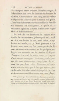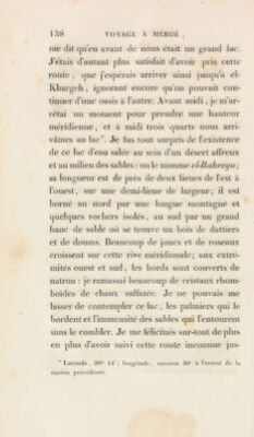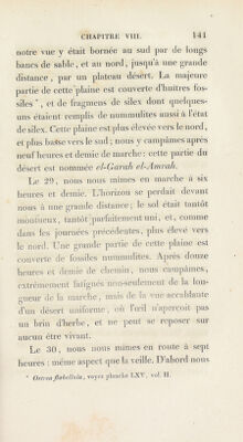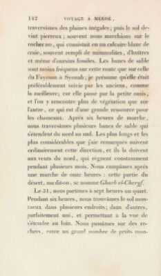 ![traversâmes des plaines inégales; ])Lns le sol Je- vint pierreux ; souvent nous marchions sur le rocher nn , qui consistait en un calcaire blanc de craie, souvent rempli de nummulites, d’huitres et même d’oursins fossiles. Les bancs de sable sont moins trécpiens sur cette route que sur celle du Fayonm à Syouab ; je présume qu’eile était préférablement suivie par les anciens, comme la meilleure; car elle passe par la petite oasis, et l’on y rencontre plus de végétation que sur l’autre, ce qui est d’une grande ressource pour les chameaux. Après six heures de marche, nous traversâmes plusieurs bancs de sable qui s’étendent du nord au sud. Les plus longs et les plus considérables que j’aie remarqués suivent ordinairement cette direction, et ils la doivent aux vents du nord, qui régnent constamment pendant plusieurs mois. Nous campâmes après une marche de onze heures : cette partie du désert, me dit-on , se nomme Gharb el-Cheryf. Le O l, nous partîmes à sept heures un (juart. Pendant six heures, nous trouvâmes le sol mon- tueux dans plusieurs endroits ; dans d’autres, parfaitement uni, et permettant à la vue de .s’étendre au loin. Nous passâmes sur des ro- chers, entre nn grand )iomhre de petits mon-](https://iiif.wellcomecollection.org/image/b29328792_0001_0168.jp2/full/800%2C/0/default.jpg)