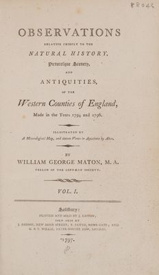 Observations relative chiefly to the natural history, picturesque scenery, and antiquities, of the Western counties of England, made in the years 1794 and 1796. Illustrated by a mineralogical map, and sixteen views in aquatinta by Alken / By William George Maton.