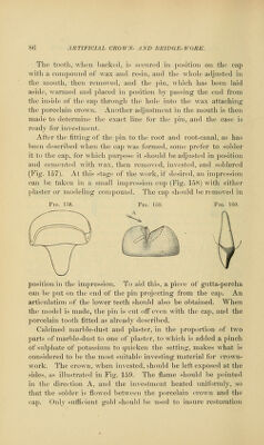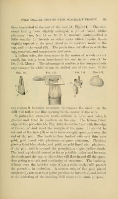 ![tlic'ii bnrnisliod to the end of the root (A, Fig. 154). Tlie I'oot- canal liaving l:)een sliglitlj enlarged, a pin of round iridio- platinum wdre, ISTo. 16 or 17, U. S. standard gaitge,—tiled a little smaller for laterals or other roots wliieli require it,—is slightly tapered at the point, titted to an aperture made in the cap, and to the canal (B). The pin is then cut off even with the cap, removed, and tem])orarily laid aside. A liollow Avire, tlic o]ien space in the center of which is very small, has lately been intro(hiced for use in crown-work by Dr. J. G. Morey. The advantage it confers is the comparatively easv manner in which it can l)e drilled out of tlie canal if for Fig. 154. Fig. 155. Fig. 156. any reason it becomes necessary to remove the crown, as the drill will follow the tine opening in the center of the wire. A plain-plate cross-pin tooth, suitable in form and color, is groinid and fitted in position on the ca]). The lal)io-cervical edge of the jiorcelain (A, Fig. 156) should l)e flush with the vilga of the collar, and meet the margin of the gum. It should be cut out at the base (B) so as to form a slight s]>ace Just ovei- the end of the ])in. The tooth is then l)acke(l witli very thin ])ure gold, gold lined A\ith platinum, or pure ])latinnm. Platinum gives a faint l»lue sluule, and gold, or gold lined with ])latinum, if the gold side is toward the porcelain, a slight yellow shade. The backing should extend as far as ])<)ssible under and between the tooth and the cap, as the solder will flow in aiul fill the space, thus giving strength and continuity of structure. The backing, if bent over the incisive edge (C) at a right angle, will ]>rotect the porcelain in occlusion. A nai-row strip of fine gold ]»laced transversely across at that point ]ire\iousto investing, and united in the soldering of the backing, will answer the same purpose.](https://iiif.wellcomecollection.org/image/b21223105_0085.jp2/full/800%2C/0/default.jpg)