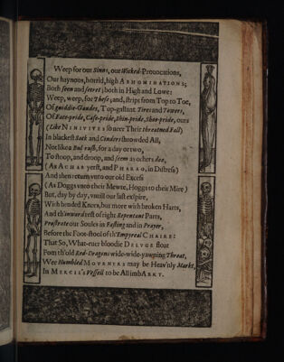 ![| Weep forout Sinns, our Wicked-Prouocations, Se] Our haynous,horrid,high A som IN ATION $5 9 Both feen and fecret ;both in High and Lowe: | 4 Weep, weep, for The/e sand, ftripc from Top to Toe, | Of giddie-Gandes, T op-gallant Tires and Towers, Of Face-pride, Cafe-pride,Shin-pride,Shoo-pride, ours (LikeNinivites fOncer Their threatned Fall) ui} In blackeft Sack and Cinders throwded All, Notlikea Bal rafh, for aday ortwo, 4 Toftoop,anddroop, and /eem as others doo, ST (AsAcuas yerftandP zara 0, in Diftrefs) 7] And then recurn vnto our old Excel (As Doggs vato their Mewte, Hoggsto their Mire ) But, day by day, vntill our fat exipire, S41 Wich bended Knees, but more with broken H arts, |: =A) And thinwardref ofright Repentant Parts, W¢] Profrate our Soules in Fafting and in Prayer, NU) Before the Foor-ftool of th'EmpyrealC Haine: j HT That So, What-eucr bloodie D &'t vGE floar Fomth’old Red-Dragons wide-wide-yawning Throat, ie] Wee Humbled Movxnens may be Heav'nly Arte b [In Mexere’sPefell tobcAllimbA xx t, 7 “ fi . SiROR TRB Ha eae ewesaiie He rt pte mae RE as a: —— satincibe SEDER TERR Sea Srniele eae tame! aes,](https://iiif.wellcomecollection.org/image/b30340810_0025.jp2/full/800%2C/0/default.jpg)