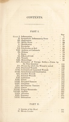 ![CONTENTS PART I. Page Chap. I. Inflammation - - ] II. Sympathetic Inflammatory Fever - - 17 III. Suppuration - - 20 IV. Hectic Fever ... g$ V. Mortification - - 37 VI. Erysipelas - - - 55 VII. Furunculus, or Boil - - - 64? VIII. Anthrax, or Carbuncle - - 67 IX. (Edema - - - 72 X. Burns. - - . 74 XI. Effects of Cold - - - $2 XII. Wounds - r -93 XIII. Hemorrhage - - - 98 XIV. Extraction of Foreign Bodies — Union by the First Intention - - 118 XV. Process by which the Wound is united 129 XVI. Punctured Wounds - , 133 XVII. Contused and Lacerated Wounds - 137 XVIII. Granulations and Cicatrization - - 14! XIX. Gunshot Wounds - - 144 XX. Poisoned Wounds - -162 XXI. Contusions - - » 170 XXII. Ulcers - - - 172 XXIII. Encysted Tumours - - » 182 XXIV. Ganglions - - - 184 XXV. Sarcomatous Tumours - - 186 XXVI. Cancer - - - 191 XXVII. Fungus Fleematodes - - 213 XXVIII. Syphilis - - - 216 XXIX. Aneurism - - 247 XXX. Fractures - - 273 XXXI. Dislocations - - 282 PART II. I. Injuries of the Head - » 291 II. Hernia Cerebri - . 304,](https://iiif.wellcomecollection.org/image/b29316418_0009.jp2/full/800%2C/0/default.jpg)