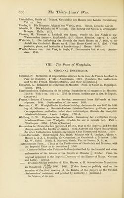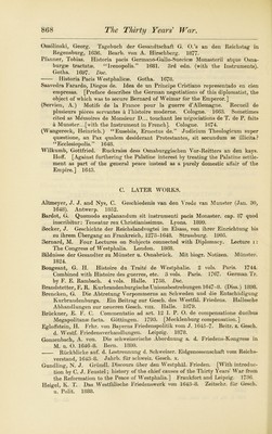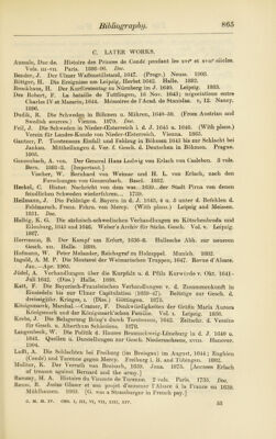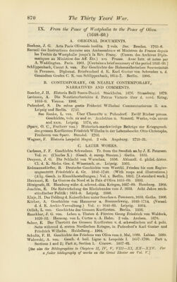 ![IX. P Worn the Peace of Westphalia to the Peace of Oliva. (1648-60.) A. ORIGINAL DOCUMENTS. Boehme, J. G. Acta Pacis Olivensis inedita. 2 vols. Doc. Breslau. 1763-6. Recueil des Instructions donnees aux Ambassadeurs et Ministres de France depuis les Traite's de Westphalie jusqu’a la Rev. Fran^. (Comm, des Archives Diplo- matiques au Ministere des Aff. Etr.) xvi. Prusse. Avec Intr. et notes par A. Waddington. Paris. 1901. [Contains a brief summary of the period 1648-60.] Schlippenbach, Count A. von. Zur Geschichte der Hohenzollerischen Souveranitat in Preussen. Diplomat. Briefwechsel d. K. Karl Gustav von Schweden u. d. Gesandten Grafen C. K. von Schlippenbach, 1654-7. Berlin. 1906. B. CONTEMPORARY, OR NEARLY CONTEMPORARY, NARRATIVES AND COMMENTS. Boeder, J. H. Historia Belli Sueco-Danici. Stockholm. 1676. Strassburg. 1679. Levinson, A. Die Nuntiaturberichte d. Petrus Victoris uber d. nord. Krieg, 1655-8. Vienna. 1906. Pufendorf, S. De rebus gestis Friderici Wilhelmi Commentariorum 11. xix. Leipzig and Berlin. 1733. See Ranke, L. von. Uber Chemnitz u. Pufendorf. Zwolf Bucher preuss. Geschichte, vols. in and iv. Analekten ii. Sammtl. Werke, vols. xxvm and xxix. Leipzig. 1874, etc. (Sparr, O. C., Freiherr von.) Historisch-merkwiirdige Beitrage zur Kriegsgesch. desgrossen Kurfiirsten Friedrich Wilhelm in der Lebensbeschr. Otto Christophs, Freiherrn von Sparr. Stendal. 1793. Wagner, F. Historia Leopoldi Magni. 2 vols. Augsburg. 1719-31. C. LATER WORKS. Carlsson, F. F. Geschichte Schwedens. Tr. from the Swedish Ms.by J. E. Petersen. Vol. iv. (Charles X.) (Gesch. d. europ. Staaten.) Gotha. 1855. Droysen, J. G. Die Schlacht von Warschau. 1656. Abhandl. d. philol.-histor. Cl. d. K. Sachs. Ges. d. Wissensch. iv. Leipzig. 1863. Erdmannsddrffer, B. Deutsche Geschichte vom Westfal. Frieden bis zum Regier- ungsantritt Friedrich’s d. Gr. 1648-1740. (With maps and illustrations.) (Ailg. Gesch. in Einzeldarstellungen.) Vol. i. Berlin. 1892. [A standard work.] Haumant, E. La Guerre du Nord et la Paix d’Oliva 1655-60. 1893. Hitzigrath, H. Hamburg wahr. d. schwed.-dan. Krieges, 1657-60. Hamburg. 1905. Joachim, E. Die Entwickelung des Rheinbundes vom J. 1658. Acht Jahre reich- standischer Politik: 1651-8. Leipzig. 1886. Klaje, H. Der Feldzug d. Kaiserlichen unter Souches n. Pommern, 1659. Gotha. 1906. Kocher, A. Geschichte von Hannover u. Braunschweig, 1648-1714. (Veranl. d. d. K. Arcliiv-Verwaltung.) Vol. i: 1648-68. Leipzig. 1884. Orlich, L. von. Geschichte des Grossen Kurfiirsten. Berlin. 1836. Rauchbar, J. G. von. Leben u. Thaten d. Fiirsten Georg Friedrich von Waldeck, 1620-92. Herausg. von L. Curtze u. A. Hahn. 2 vols. Arolsen. 1870. Salzer, E. Der Ubertritt des Grossen Kurfiirsten v. d. schwedischen auf d. poln. Seite wahrend d. ersten Nordischen Krieges, in Pufendorf’s Karl Gustav und Friedrich Wilhelm. Heidelberg. • 1904. Schultz, F. H. Geschichte des Friedens von Oliva vom 3. Mai, 1660. Labiau. 1860. Walewski, A. von. Gesch. d. heil. Ligue u. Leopolds I. 1657-1700. Part i. Sections 1 and 2; Part n, Section 1. Cracow. 1857-61. [See also the Bibliographies to Chapters II, IV, V, VIII—XI, XX—XXV. For a fuller bibliography of works on the Great Elector see Vol. V.]](https://iiif.wellcomecollection.org/image/b24874802_0906.jp2/full/800%2C/0/default.jpg)