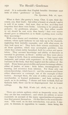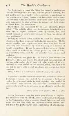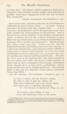 ![Carlo : Good steps to gentility too, marry : but, Sogliardo, if you affect to be a gentleman indeed, you must observe all the rare qualities, humours,and compliments of a Gentleman.... First, to be an accomplished gentleman, that is, a gentle- man of the time, you must give over housekeeping in the country, and live altogether in the city amongst Gallants . . . but above all, protest in your play and affirm. Upon your credit, As you are a true gentleman, at every cast; you may do it with a safe conscience, I warrant you. Sogliardo : O admirable rare ! he cannot choose but be a gentleman that has these excellent gifts. . . . Carlo : You must talk much of your kindred and allies. . . . You must pretend alliance with courtiers and great persons. 1598, B. Jonson, Every Man out of His Humour, act i, sc.i. Sogliardo : I can write myself gentleman now ; here’s my patent, it cost me thirty pound, by this breath. [The crest] it is your boar without a head rampant. Carlo : Troth, I commend the herald’s wit, he has decyphered him well : a swine without a head, without brain, wit, any- thing indeed, ramping to gentility. Id., act hi, sc. i. Fungoso : If a man had any true melancholy in him, it would make him melancholy to see his yeomanly father cut his neighbours’ throats to make his son a gentleman ; and yet, when he has cut them, he will see his son’s throat cut too, ere he make him a true gentleman indeed, before death cut his own throat. I must be the first head of our house, and yet he will not give me the head till I be made so. Is any man termed a gentleman, that is not always in the fashion ? I would know but that. 1598, B. Jonson, Every Man Out of His Humour, act. iv, sc. i. On January 4, 1699, a judgment was given by the Royal Commissioners in Council at Lyons on the question whether lawyers and doctors were to be regarded as ‘ gentlemen ’. There has been a good deal of evasion of taxation by persons who usurped the title of gentlemen, or noblemen, and there- fore claimed exemption, and this had necessitated several ‘ arrests ’, or decisions, against those thus evading taxation.](https://iiif.wellcomecollection.org/image/b29008529_0165.jp2/full/800%2C/0/default.jpg)