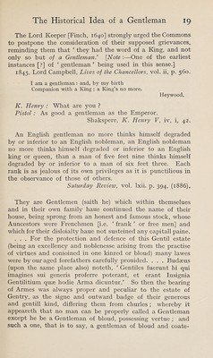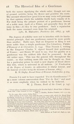 ![{Roman de Rou, 5955-5974). This is perhaps the earliest use of a word so familiar both in French and in English, but which bears such different meanings in the two languages. But whoever was a gentleman in the language of Richard’s Court it is plain that the word took in all who could pretend to any kind of kindred or affinity, legitimate or illegitimate, with the sovereign. 1877, E. A. Freeman, The Norman Conquest (3rd ed.), vol. h p. 255. An early use of the term is as follows : Tuo old gentille men Edrick did forfare, The ton hight Sigiferd, the tother Sir Morgare. 1338, Robert of Brunne, Chronicle, p. 46 (ed. 1810). Vulgar use now hath so altered the genuine sense of Genero- sus, that it frequently denotes any kind of Gentleman, either by birth or otherwise truly enjoying that name as well as Nobilis. But it was long before the constant use of Generosus was with us for the title of Gentleman in our Writs, Counts, Pledings, and such like. Till about Henry VIII the very word Gentilman was often retained for the addition in the Latin, as we see in the Rolls of the precedent times. But then Generosus came to be constantly with us used for a Gentleman of what sort soeuer, if his Title were no greater. —Selden, Titles of Honor, p. 858, ed. 1631. [Sir T. Elyot, The Gouvernour (ed. Croft), vol. ii, p. 28.] The Crusades were probably the great means of inspiring an uniformity of conventional courtesy into the European aristocracy, which still constitutes the common character of gentlemen ; but it may have been gradually wearing away their national peculiarities for some time before. Hallam, Literature of Europe (ed. 1869), vol. i, p. 134. Hauing discoursed of Nobilitie in Generali, the diuision, and vse thereof : giue me leaue in a word to inueigh against the pitifull abuse thereof, which like a plague, I think, hath infected the whole world ; every vndeseruing and base Peasant ayming at Nobilitie : which miserable ambition hath so fur- nished both Towne and Country with Coates of a new list;](https://iiif.wellcomecollection.org/image/b29008529_0033.jp2/full/800%2C/0/default.jpg)