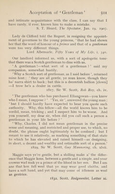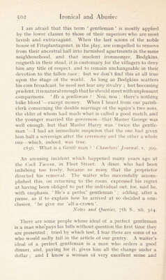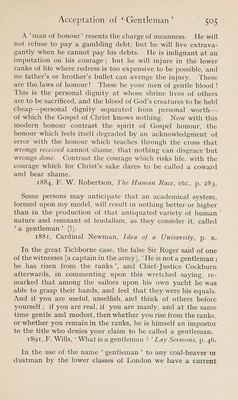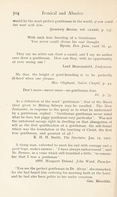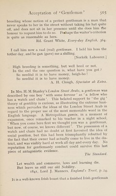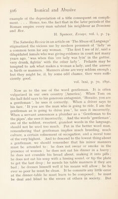 ![example of the depreciation of a title consequent on coinpli- . • . Hence, too, the fact that in the latei peiiods of the Roman empire every man saluted his neighbour as Dominus and Rex. H. Spencer, Essays, vol. i, p. 74. The Saturday Review in an article on ‘The Abuse of Language’ stigmatized the vicious use by modern pressmen of ‘ lady ’ as a common term for any woman. ‘The first I see of it.’, said a dilapidated female who was giving evidence in court not many years ago, ‘ was when this ’ere lady was lyin in the guttur, very drunk, fightin’ with the other lady . Pedants may be tempted to ask what makes a woman a lady, and the answer is, birth or manners. Manners alone are very seldom enough ; but they might be, if, by some odd chance, thev weie suffi- ciently good. vol. Ixxi, p. 70, 1891. Now as to the use of the word gentleman. It is often vulgarized in our own country [America]. When Tom on the ball field says to his generous antagonist, ‘ Horatio, you are a gentleman ’, he uses it correctly. W^hen a diiver says to his fare, ‘ If you are the man who is going to ride, I am the gentleman as is going to drive you ’, he uses it incoriectly. When a servant announces a plumber as a ‘ Gentleman to fix the pipes’, she uses it incorrectly. And the words ‘gentleman’, one of the noblest, sweetest, grandest words in the language, should not be used too much. Put in the better word man, remembering that gentleman implies much bleeding, much culture, a certain refinement of occupation, and a moial tone of the very highest. And to descend to the lowest thing about a gentleman, we should remember that his minor manners must be attended to ; he does not sweai 01 smoke in the presence of women ; he does not eat his dinnei in a huiiy , he does not crumble his bread about, making it into pills ; he does not eat his soup with a hissing sound, or tip the plate to get the last drop he mends his table manners if they are bad ; he dresses himself well if his means will allow ; be he ever so poor he must be clean. If he commits any little error at the dinner-table he must learn to be composed ; he must be deaf and blind to the errors of otheis in society. Put](https://iiif.wellcomecollection.org/image/b29008529_0524.jp2/full/800%2C/0/default.jpg)