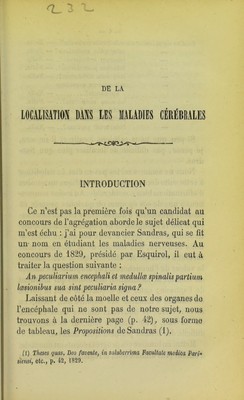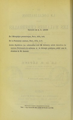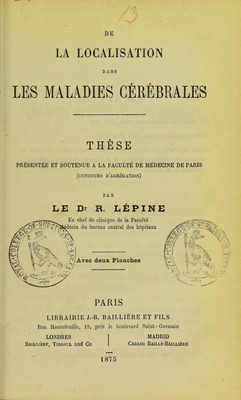 De la localisation dans les maladies cérébrales : thèse présentée et soutenue à la Faculté de médecine de Paris (concours d'agrégation) / par R. Lépine.