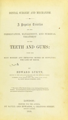 Dental surgery and mechanism : a popular treatise on the preservation, management, and surgical treatment of the teeth and gums : with the most modern and improved modes of supplying the loss of teeth / by Edward Lukyn.