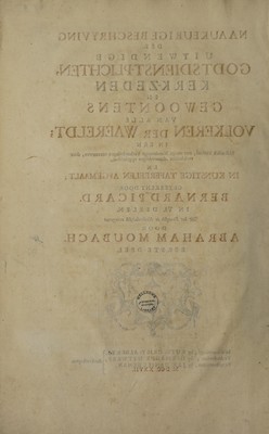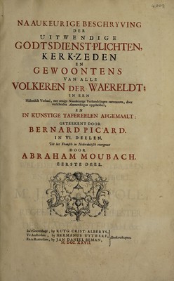 Naaukeurige beschryving der uitwendige godtsdienst-plichten, kerk-zerden en gerwoontens van alle volkeren der waereldt in een historisch verhaal, met eenige naaukeurige verhandelingen ontvouwen, door verschedien aanmerkingen opgeheldert; en in kunstige tafereelen afgemaalt / geteekent door Bernard Picard ... Uit het Fransch in Nederduitsch overgezet door Abraham Moubach.