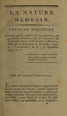 La nature medecin, ou, Recueil de divers discours sur les points les plus intéressans pour ceux qui exercent l'une ou l'autre branche de l'art de guérir, et non moins utiles à quiconque est dans le cas d'y recourir / par le médecin Vanasbroeck.
