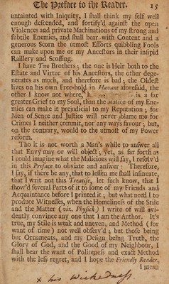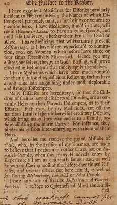 Credit: Levamen infirmi: or, cordial counsel to the sick and diseased. Containing I. Advice concerning physick and what a physician ought to be; with an account of the author's remedies ... II. Concerning melancholy, frensie, and madness; in which ... is shew'd, how far they differ from a conscience opprest with ... sin ... III. A miscellany of pious discourses ... To which are added several predictions of what may happen to end of the world / [David Irish]. Source: Wellcome Collection.