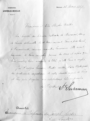 M0019577: Letter to Joseph Lister from the Society of Medical Science of Bucarest, 1887