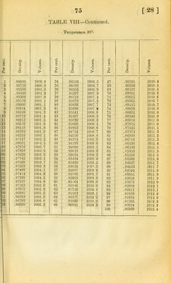 ![TABLE VIII—Continued Temperature 37°. Per cent. Density. Volume. Per cent. Density. 1 .99859 1000.9 34 .96637 2 .99719 1000.9 35 .96526 3 .99579 1001.0 36 .96414 4 .994.19 1001.0 37 .96298 5 .99300 1001.0 38 .96183 6 .99177 1001.1 39 .96043 7 .99061 1001.2 40 .95903 8 .98947 1001.3 4) .95757 9 .98831 1001.4 42 .95610 10 .98716 1001.5 43 .9.5457 11 .98618 1001.6 44 .95301 12 .98523 1001.7 45 .95141 13 .98427 1001.9 46 '.94977 14 .98391 1002.0 47 .94809 ]5 .98243 1002.2 48 .94631 16 .93160 1002.4 49 .94451 17 .98076 1002.6 50 .94269 18 .97993 1002.8 51 .94086 19 .97917 1003.1 52 .93897 20 .97843 1003.4 53 .93705 21 .97770 1003.7 54 .93505 :22 .97695 1004.0 55 .93.301 :23 .97612 1004.2 56 .93097 ;24 .97530 1004.4 57 .92888 :25 .97447 1004.6 58 •92679 i26 .97365 1004.8 59 .92466 :27 .97285 1005.1 60 .92247 :28 .97204 1005.4 61 .920-29 i29 .97118 1005.7 62 .91811 130 .97030 1006.0 63 .91587 i31 .96942 1006.3 64 .91362 .96843 1006.5 65 .91135 733 .96743 1006.8 66 .90906 Volume. Per cent. Density. S 3 o > 1007.0 67 .90678 1011.4 1007.3 68 .90437 1011.4 1007.6 69 .90193 1011.4 1007.9 70 .89948 1011.5 1008.1 71 .89702 1011.6 1008.2 72 .'89453 1011.7 1008.4 73 .89-203 1011.7 1008. 5 74 .88947 1011.8 1008.7 75 .88689 1011.8 1008.9 76 . 88429 1011.9 1009.0 77 .88167 1012.0 1009.2 78 .§7904 1012.1 1009.3 79 .87634 1012.2 1009.5 80 .87363 1012.3 1009.6 81 .87089 1012.4 1009 7 82 .86809 1012.4 1009.8 83 .86.529 ltll2.5 1010.0 84 .86240 1012.6 1010 1 85 .85944 1012.6 1010.2 86 .85649 1012.6 1010.3 87 .85340 1012.7 1010.4 88 .85028 1012.8 1010.4 89 .84714 1012.3 1010.5 90 .84386 1012.9 1010.6 91 .84047 1013.0 1010.7 92 .83708 1013.0 1010.8 93 .83367 1013.1 1010.9 94 .82991 1013.2 1011 0 95 .82603 1013.2 1011.0 96 .82201 1013.3 1011.1 97 .81786 1013.3 1011.1 98 .81358 1013.4 1011.2 99 .80916 1013.4 100 .80460 1013.5](https://iiif.wellcomecollection.org/image/b2232821x_0075.jp2/full/800%2C/0/default.jpg)