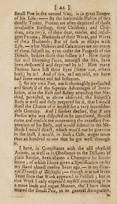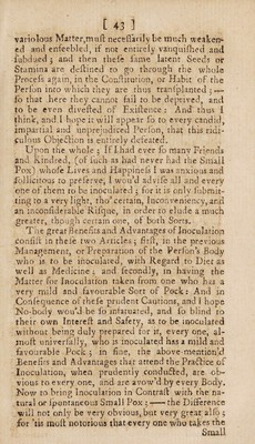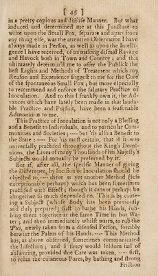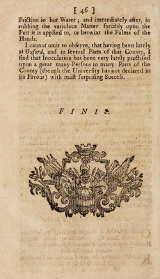 Credit: An essay on the small pox ... To which is subjoin'd ... reflections ... on the modern practice of inoculation. In which the two grand objections ... are examin'd and refuted / [Charles Perry]. Source: Wellcome Collection.