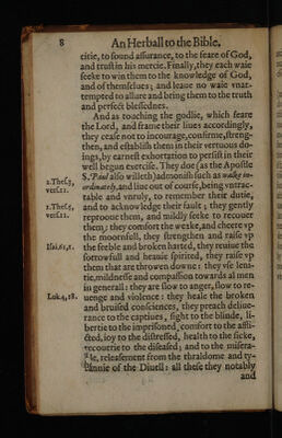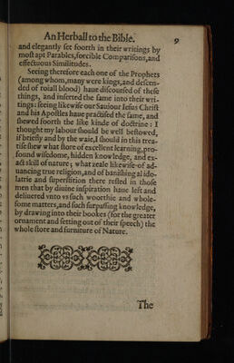 An herbal for the Bible. Containing a plaine and familiar exposition of such similitudes, parables, and metaphors, both in the Olde Testament and the Newe, as are borrowed and taken from herbs, plants, trees, fruits and simples, by observation of their vertues, qualities, natures, properties, operations, and effects / ... Drawen into English by Thomas Newton.