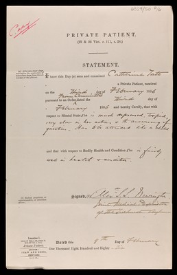 Credit: Patient Certificates and Notices: Admission date 1886. Source: Wellcome Collection.