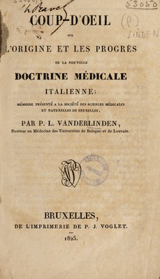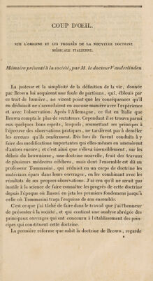 Coup-d'œil sur l'origine et les progrès de la nouvelle doctrine médicale italienne : Mémoire présenté à la Société des sciences médicales et naturelles de Bruxelles / [Pierre Léonard Vanderlinden].