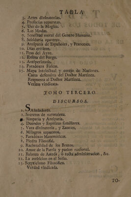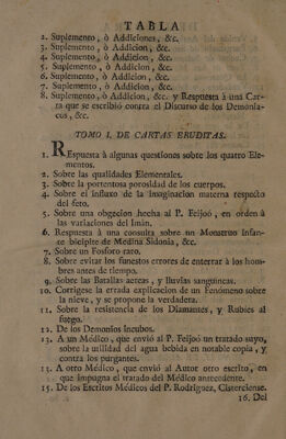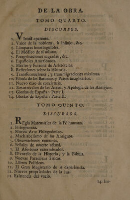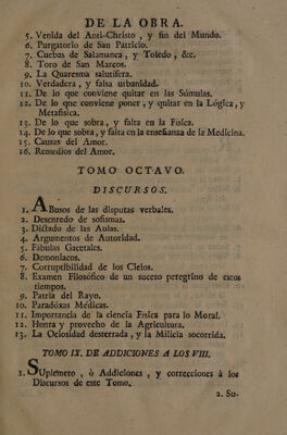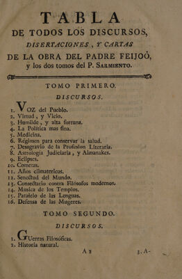 ![DE ad LOS DISCURSOS, DISERTACIONES, Y CARTAS DE LA OBRA DEL PADRE FEIJOO, y los dos tomos del P. SARMIENTO. er TOMO PRIMERO. DISCURSOS. A del Priebló. . Virtud, y Vicio, Es . Humilde, y alta fortuna. . La Política mas fina. . Medicina. . Régimen para conservar tá salud. ; Desagravio de la Profesion Literaria. . Astrología Judiciaria , y ¿A manakes, . Eclipses. 10. Cometas. 12. Sencétud del nda. | 13. Conseétario contra Filósofos modernos. A 14. Musica de los Templos. 15. Paralelo de las Lenguas. 16. Defensa de las Mugeress TOMO SEGUNDO. | DISCURSOS. l (rocas Filosóficas. 2. Historia natural. SD 60-] AA AOS Nm](https://iiif.wellcomecollection.org/image/b30516717_0007.jp2/full/800%2C/0/default.jpg)