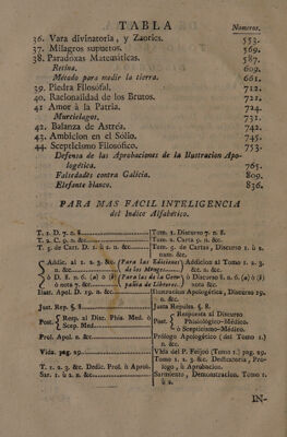 Indice general alfabetico, de las cosas notables, que contienen todas las obras del muy ilustre Señor D. Fr. Benito Geronimo Feijoó : inclusas las dedicatorias, aprobaciones, y prologos, y tambien los dos tomos de la Demonstracion critico-apologética, que en defensa del Teatro critico escribió el Rmo. P.M.D.Fr. Martin Sarmiento / Dispuesto por Don Joseph Santos.
